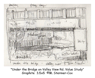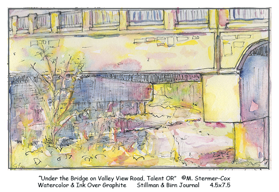 Bear Creek runs along the eastern side of Talent. There is greenway with a bike and walking path. I walked south along the path to the bridge on Valley View Road. This is part of my daily exercise route. I have been looking at this bridge for quite some time, thinking I sure would like to draw it. So, I plopped my stool down and set to work.