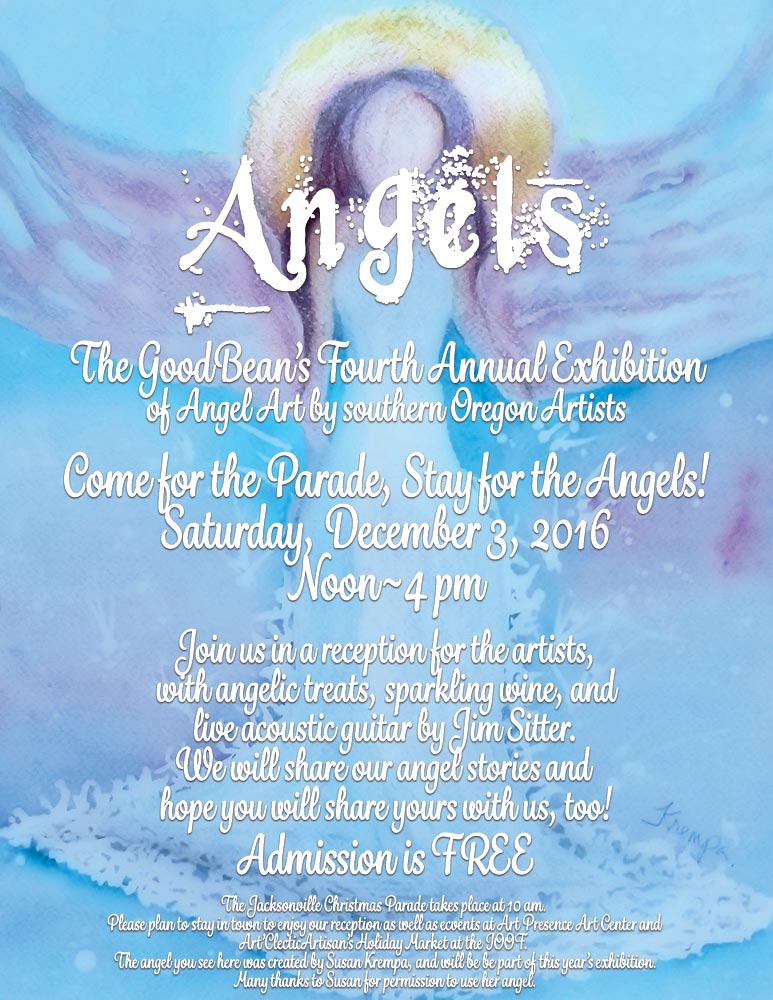 Hosted by GoodBean Coffee Company, Hannah West Designs and Southern Oregon Artists Resource, the Angels Show features artwork by local artists using a variety of media. You are invited to see the display of fine art daily during normal business hours (6am to 6pm).
